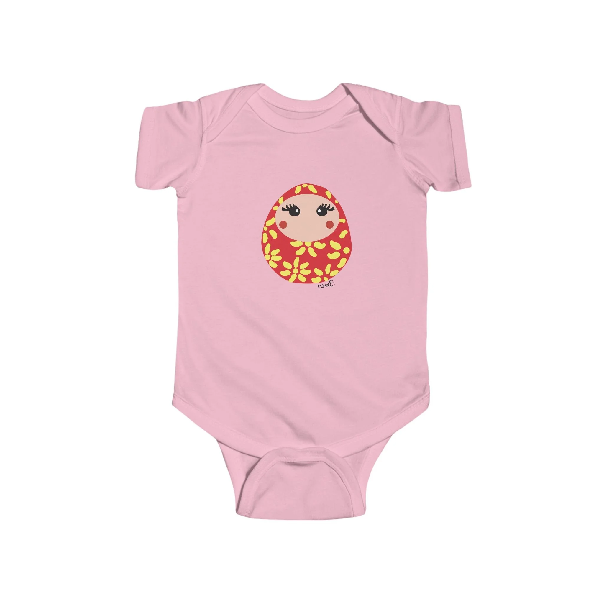 Tiny warmth wrapped in playful charm. This soft infant bodysuit carries a hand-drawn matryoshka-inspired print — rosy face, wide lashes, and a sprinkle of golden leaves — centered like a little talisman. Lightweight combed ringspun cotton sits close to baby’s skin, while the ribbed neck and side seams keep shape through washes. Snaps at the cross closure make quick changes less fussy. Put it on for slow mornings, family visits, or cozy photo moments that celebrate small personalities and folkloric whimsy.