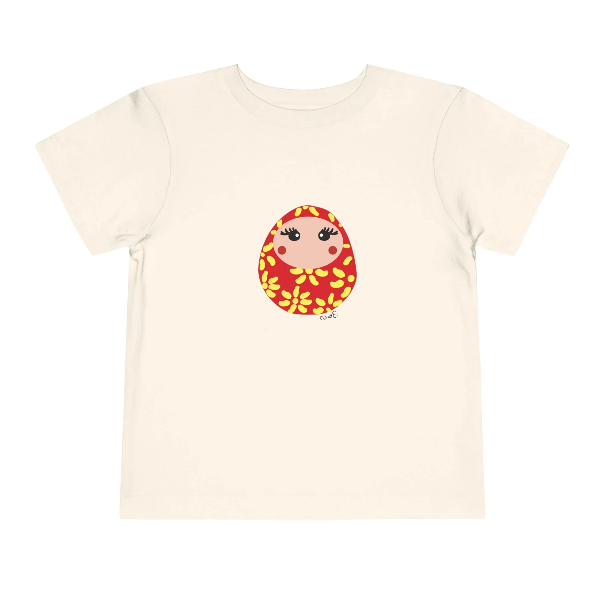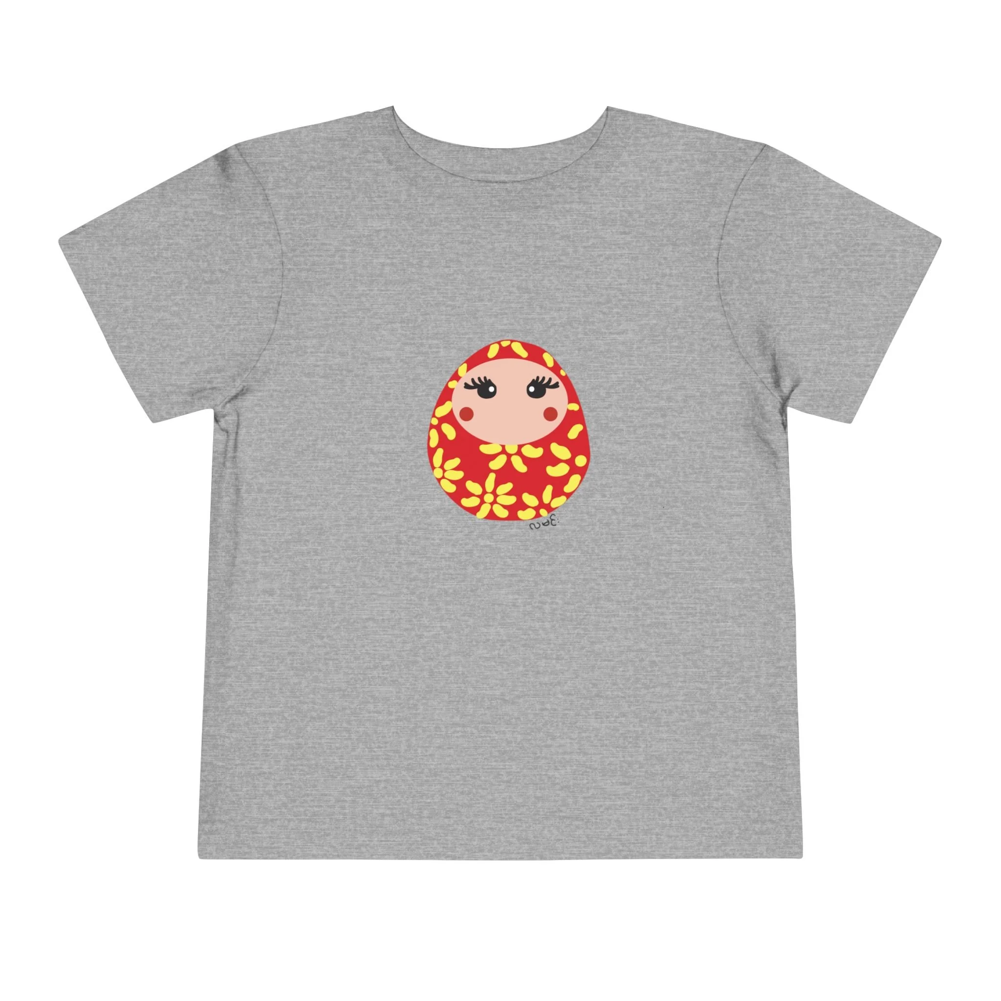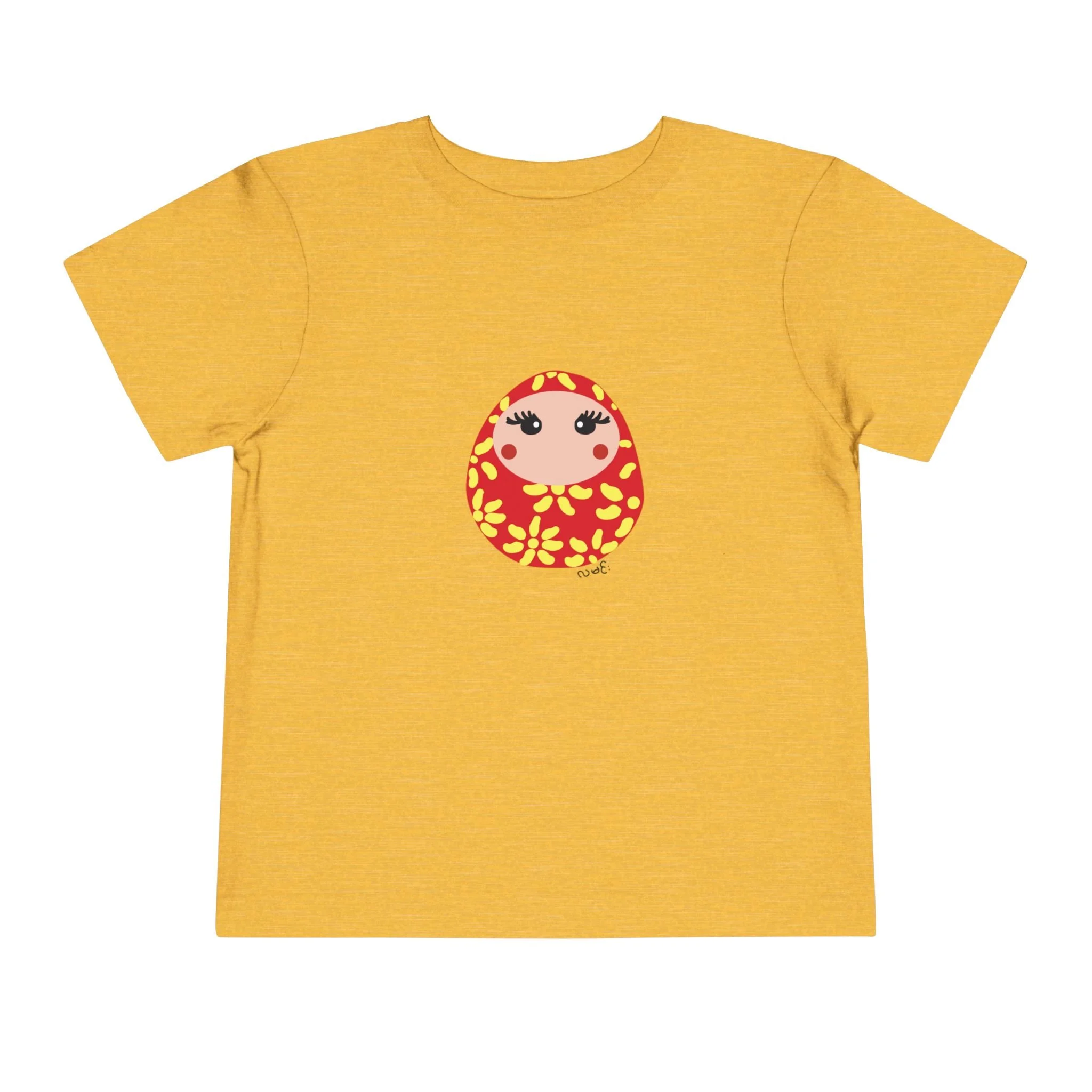 Soft, light, and a little bit playful — this toddler tee brings a tiny burst of warmth to everyday outfits. A smiling matryoshka-style character rests at the chest, its red and yellow floral pattern brightening the center of the shirt. The shirt’s featherweight cotton feels breathable on active days and the tear-away label keeps little necks comfortable. It layers easily under sweaters or stands alone for sunny park runs and family photos. Designed to move with toddlers: gentle on skin, easy to wash, and cheerful enough to become a favorite.
