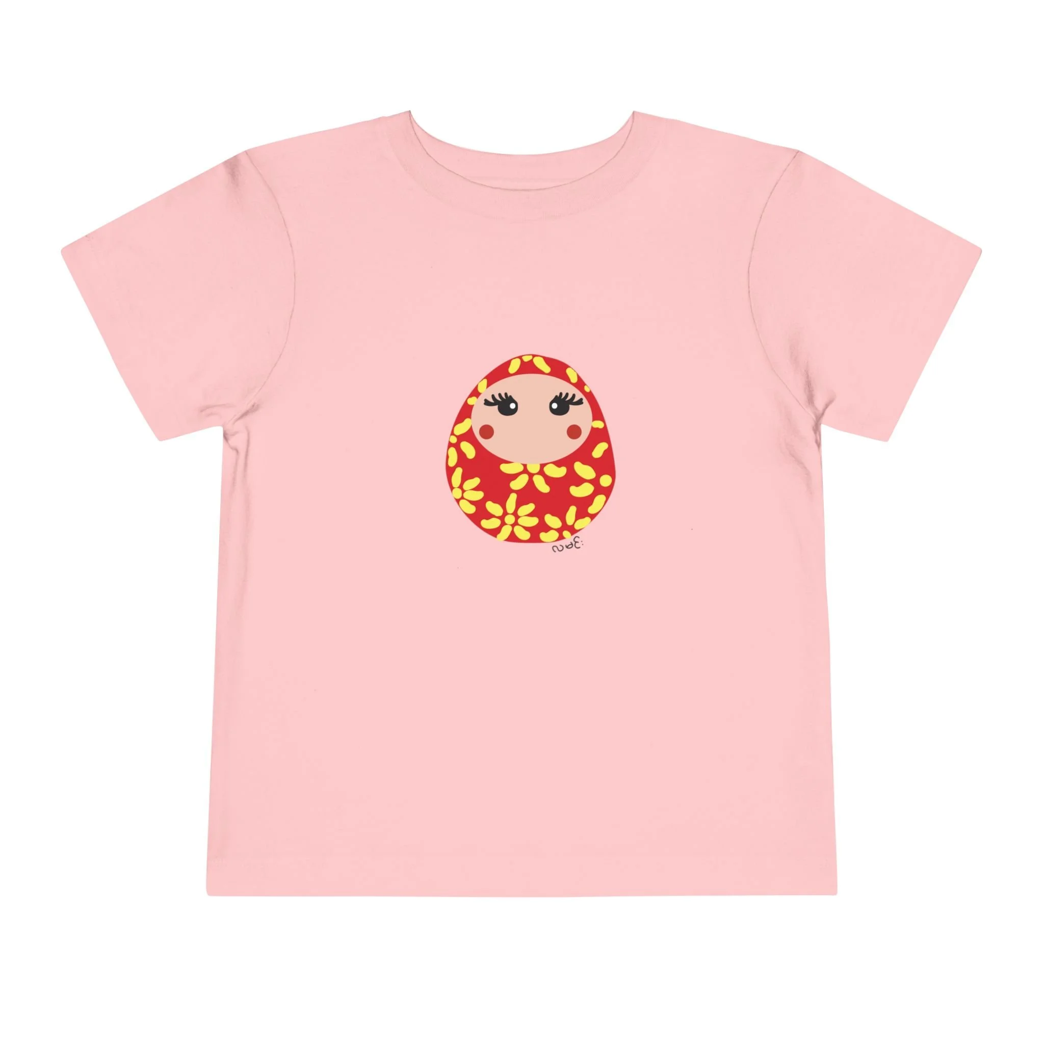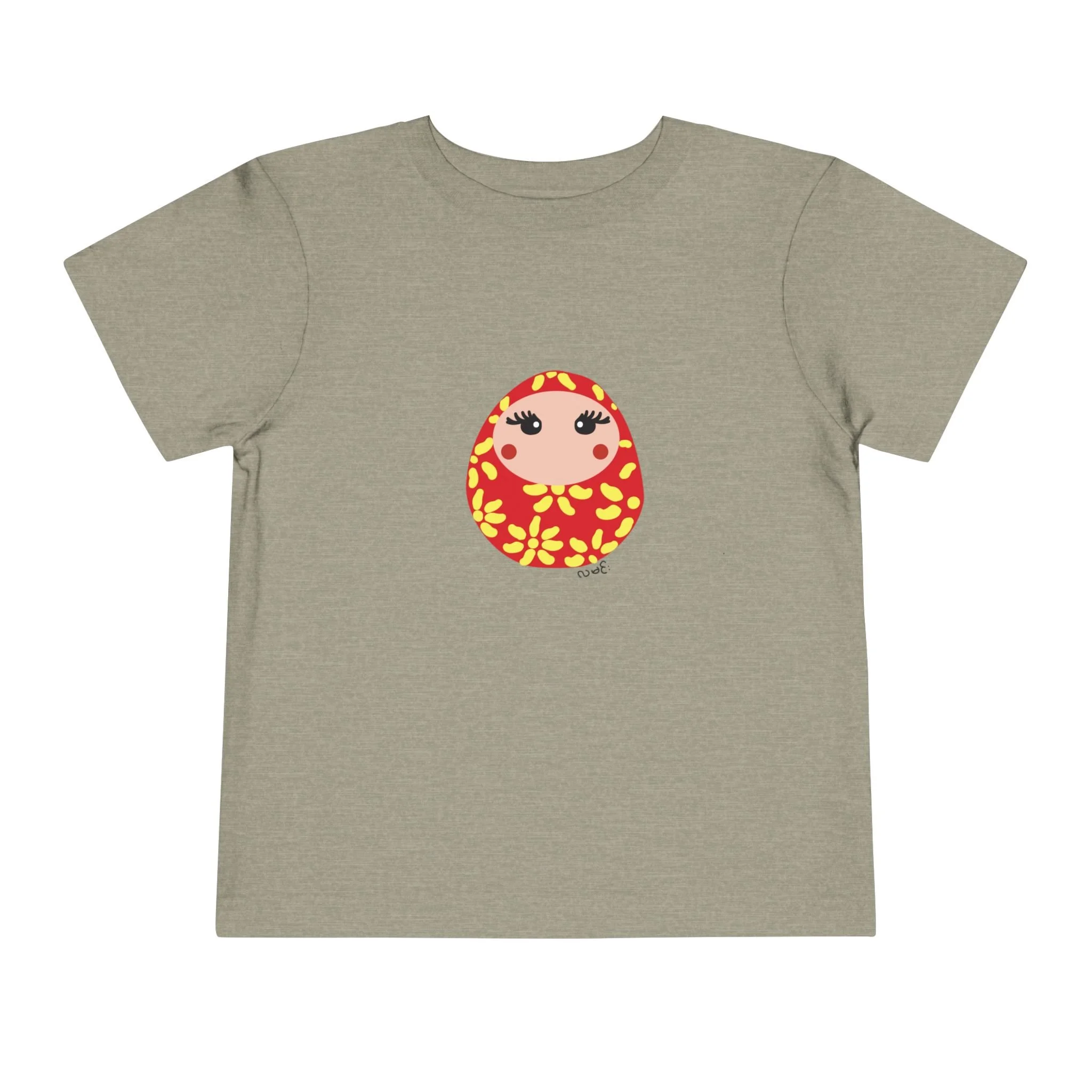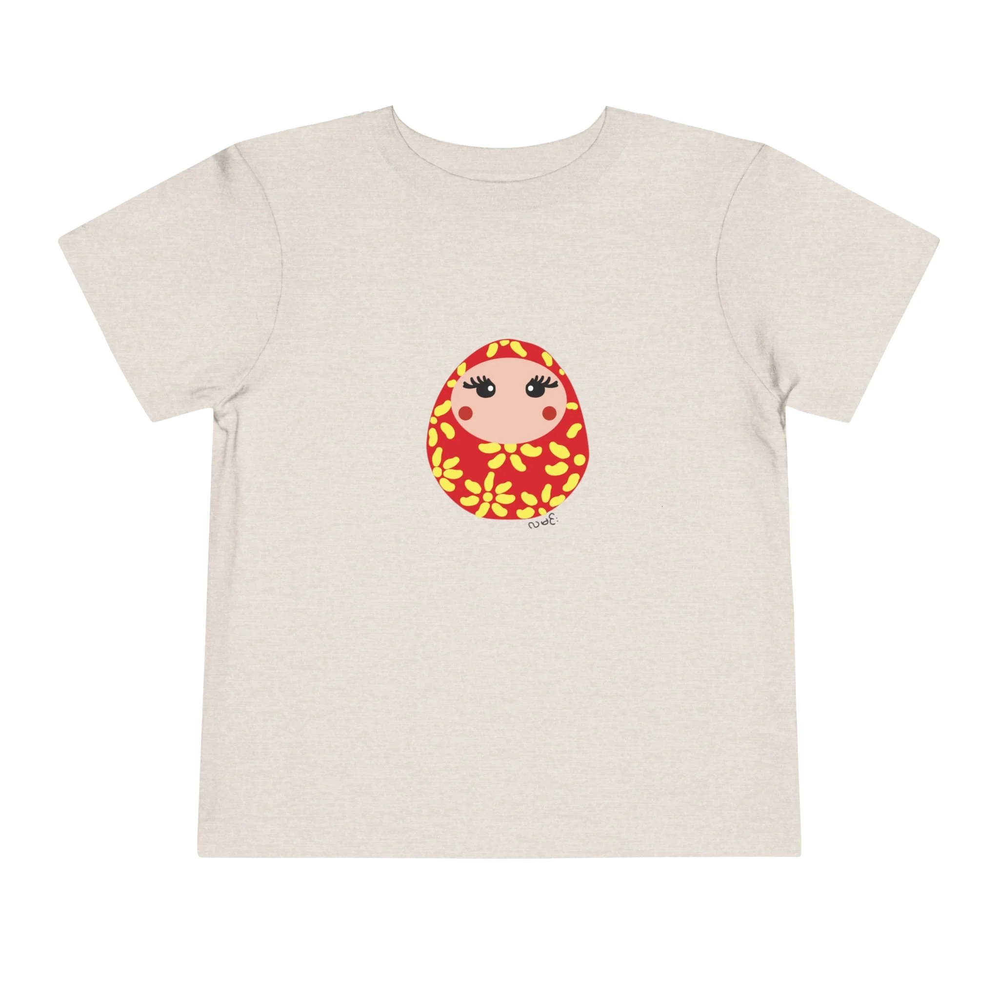 Soft, light, and a little bit playful — this toddler tee brings a tiny burst of warmth to everyday outfits. A smiling matryoshka-style character rests at the chest, its red and yellow floral pattern brightening the center of the shirt. The shirt’s featherweight cotton feels breathable on active days and the tear-away label keeps little necks comfortable. It layers easily under sweaters or stands alone for sunny park runs and family photos. Designed to move with toddlers: gentle on skin, easy to wash, and cheerful enough to become a favorite.